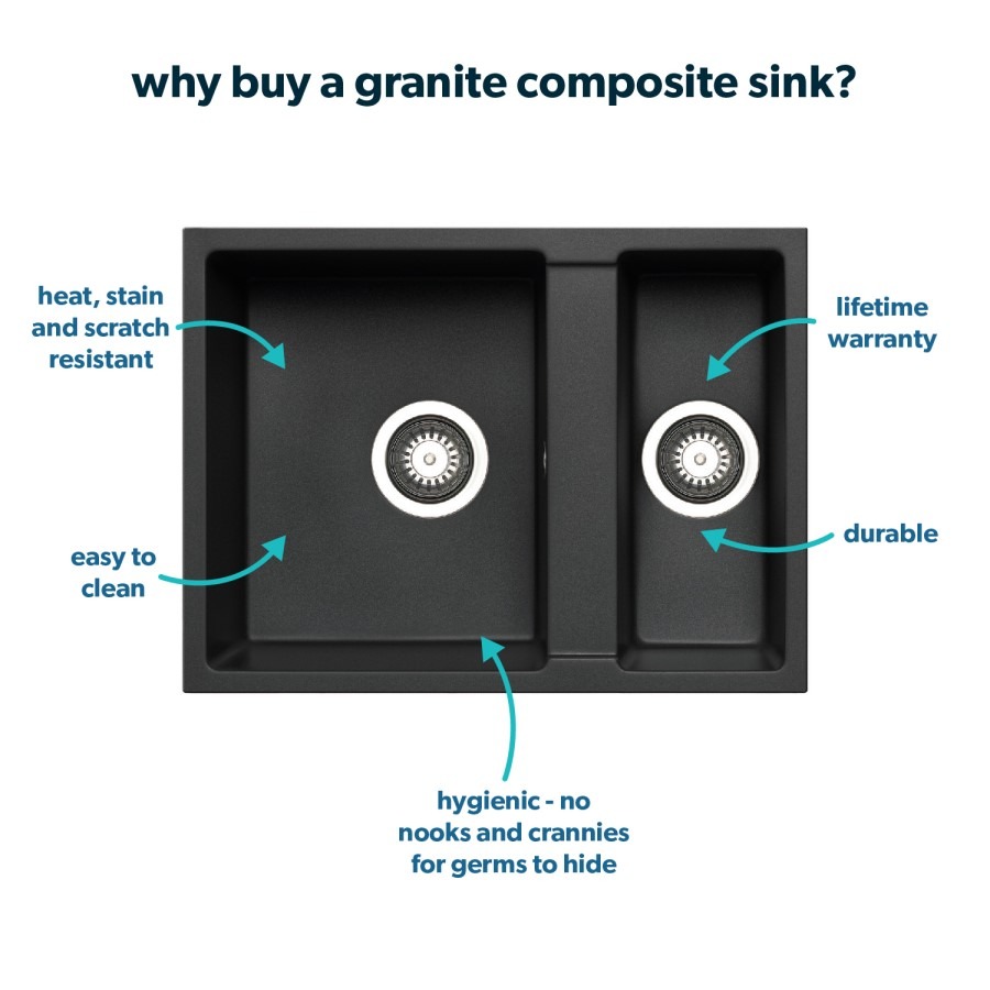 This stylish matt black composite kitchen sink is on-trend and guaranteed to create a focal point in any kitchen. Made from durable granite composite, it’s gentle on your dishware and hygienic, as there’re no nooks and crannies for germs to hide. The smooth finish means it’s low maintenance, ensuring longevity.