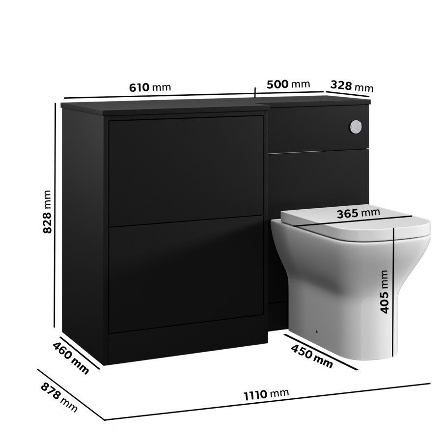 - Overall Dimensions Including Toilet: H 828mm x W 1110mm x D878mm