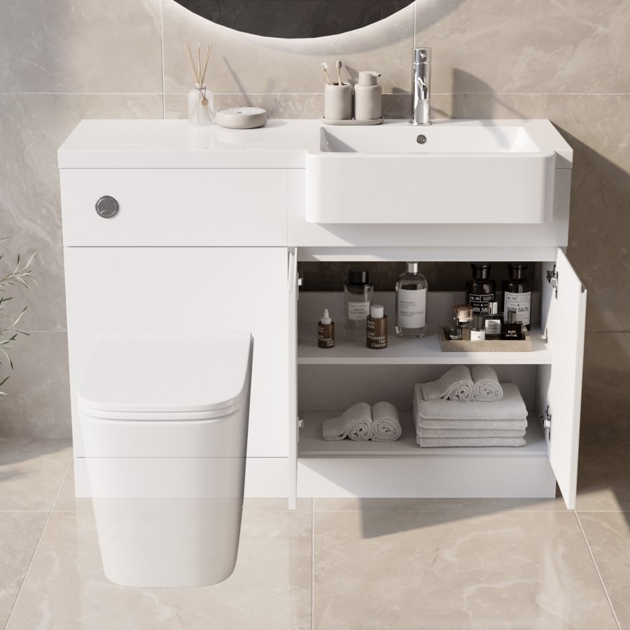 Transform your bathroom with the Bali right hand 1100mm toilet and sink unit in matt white. Not only will unsightly piping be hidden, but with its minimalist handleless design and matt finish, it will give your bathroom a final modern touch. The cabinet provides storage for your all of your bathroom supplies, whilst the resin semi-recessed basin with an integrated worktop, provides extra countertop storage space for your daily essentials.
