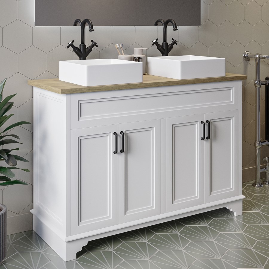 Give your bathroom a traditional makeover with the matt white Camden vanity unit. The black metal handles give the unit an industrial edge and open to reveal 2 interior shelves with room to store all your toiletries and other essentials. The unit comes with a stylish wood effect worktop and 2 white square countertop basins. The countertop basins are made from high-quality ceramic and are finished in gloss white. Remember to add your 2 tall basin mixer or wall mounted taps to complete the look. Both the unit and the worktop have a 2 years warranty for added peace of mind. The basins have a 5 years guarantee for your assurance.