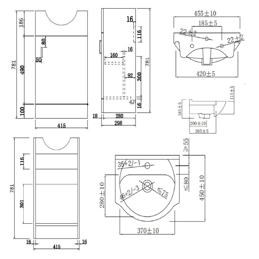 Dimensions: H840 x W455 x D460 mm – Please note, the width of this basin measures 570mm due to an overhanging lip. However, the main footprint is 514mm. The overall height of this vanity including the basin is 840mm.