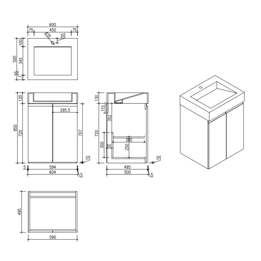 • Overall Basin Vanity Dimensions (including basin): H850 x W604 x D500 mm