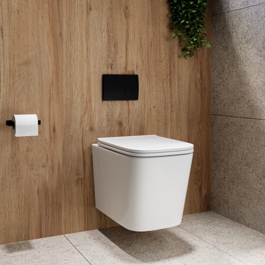 If you’re short on space, or want to elevate your bathroom, cloakroom or en-suite, then this sleek and stylish wall hung toilet is for you. It features a modern square pan and innovative rimless design. The short projection of only 520mm, means it is perfect for maximizing your bathroom space, without compromising on functionality or style. The innovative rimless design ensures a thorough clean with every flush – as water is propelled around the bowl, keeping the toilet pristine and hygienic after every use. As it is wall-hung, it’s easier to clean as it’s off the floor, giving the effect of a floating toilet. It comes complete with a soft-close slim toilet seat, made from Urea-Formaldahyde, also known as Duroplast. This premium material does not scratch, it is easy to clean and looks brand new for a long time, has a ceramic appearance, and is even resistant to cigarette burns.