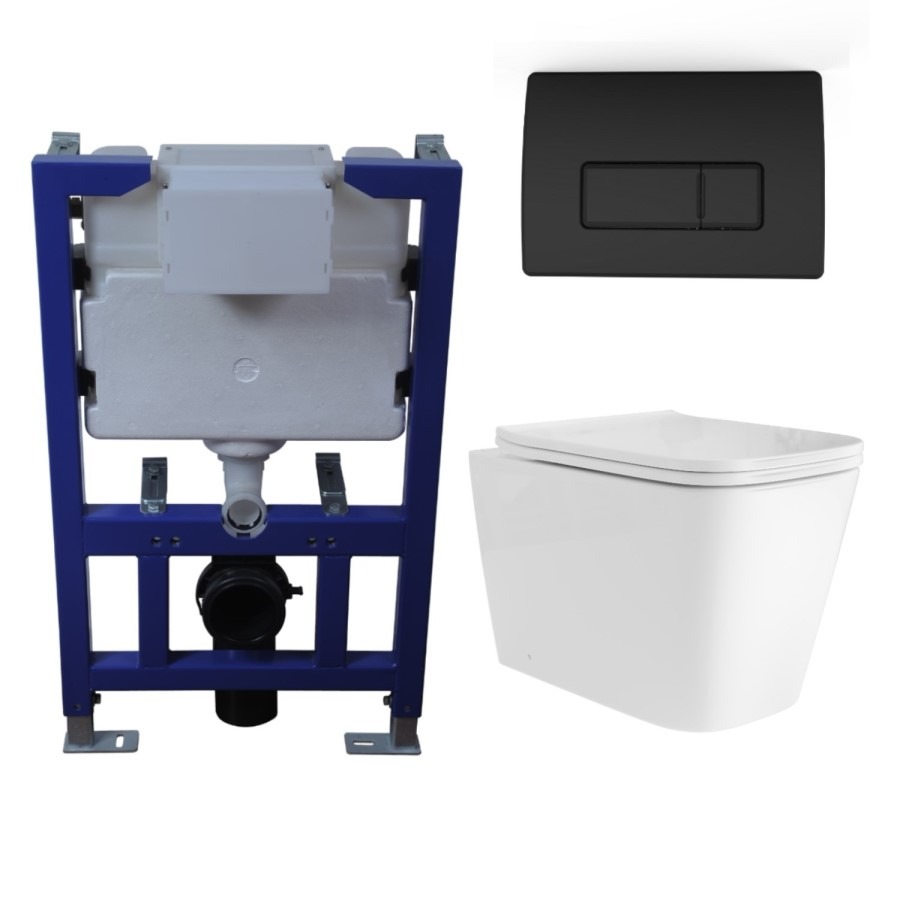 - Includes 820mm compact wall hung frame, cistern and black pneumatic flush plate