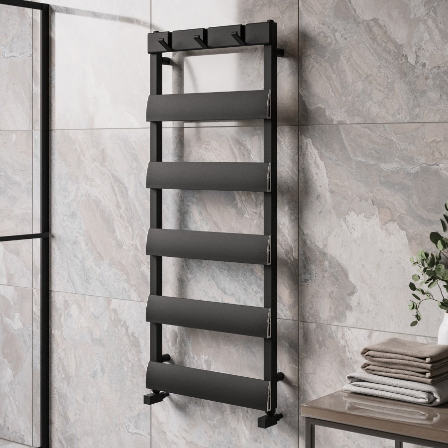 The Arizona wall mounted towel rail radiator offers a unique and stylish design, perfect for enhancing modern bathrooms. Engineered for efficient heat distribution, this radiator quickly warms your room, providing consistent comfort throughout. The hooks are designed to sit flush against your radiator, blending seamlessly with your décor. When you need extra hanging space, simply pull them down—each hook can extend to a convenient 60-degree angle.