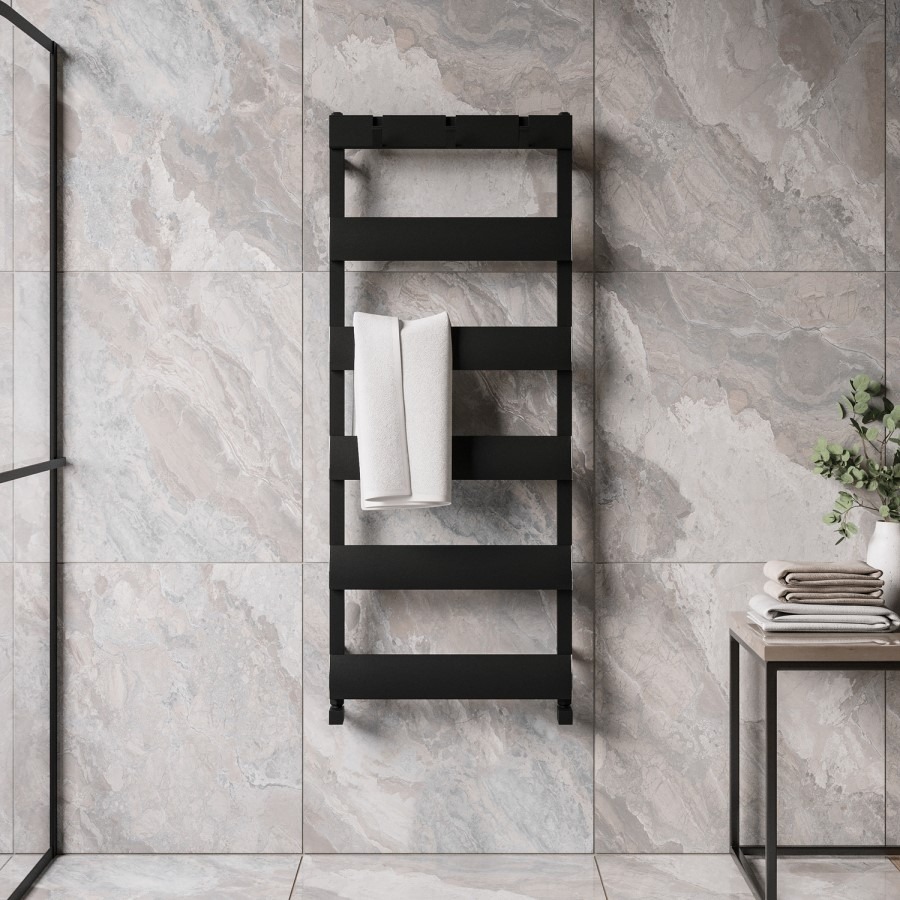 Modern matt black heated towel rail: Elevate your bathroom with a sleek, contemporary design that combines functionality with sophistication.