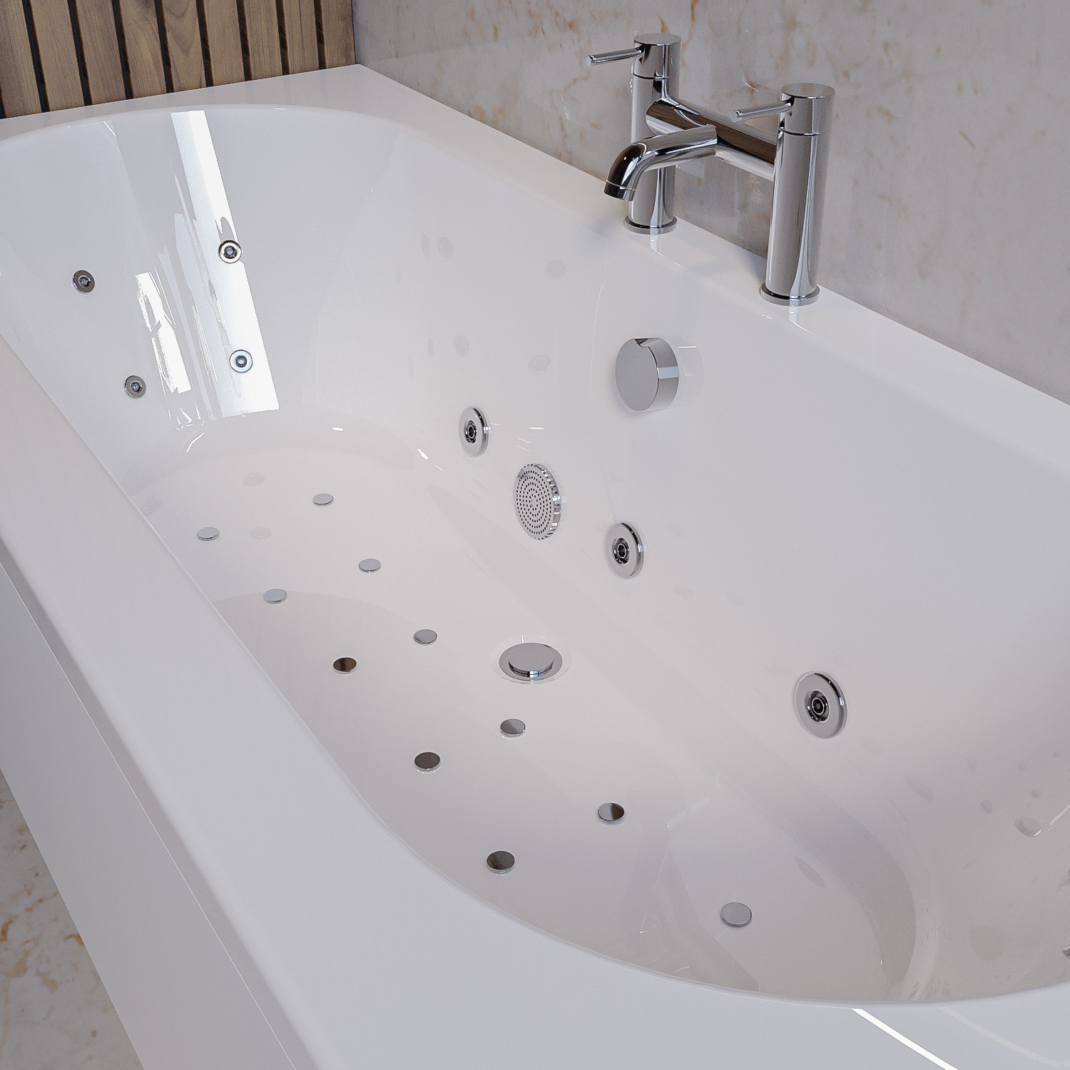 Our Burford It’s double end 1700mm bath gives you the freedom to sit at either end and has a Pneumatic switch enabling you to control the jets or turn them off altogether.  Also includes a built in heater for warm, allowing for a constant warm bathe using less hot water and its Hygienic shaped pipework promotes maximum drainage.