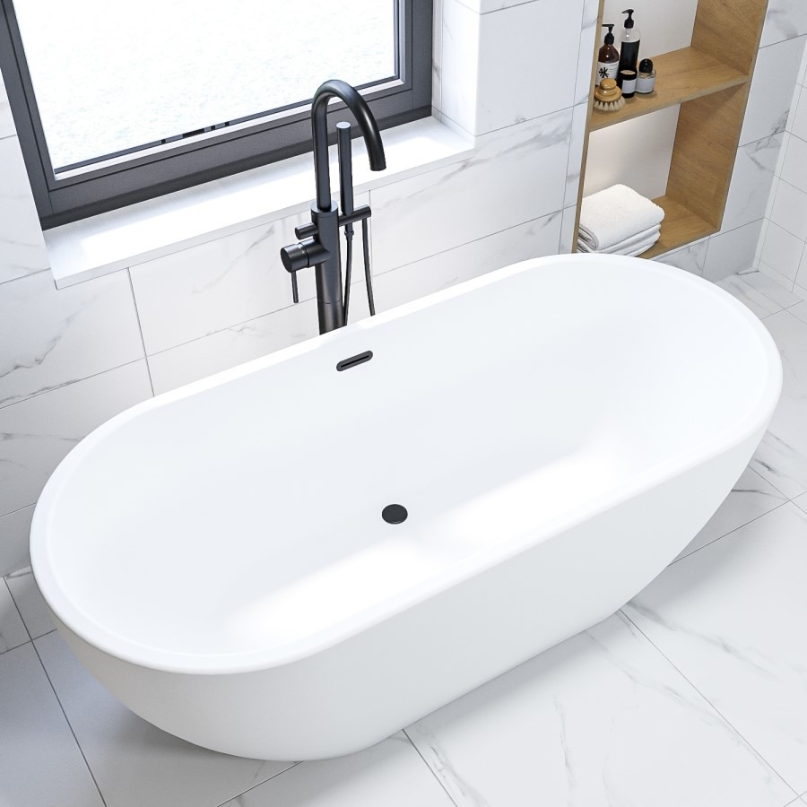 Curved and contemporary, with a matt finish and contrasting built-in matt black overflow and waste, this freestanding bath brings a touch of sophistication to the bathroom, as well as a luxurious bathing experience. With its round-ended shape and double-ended design, you can bathe comfortably and relax at either end of this tub.