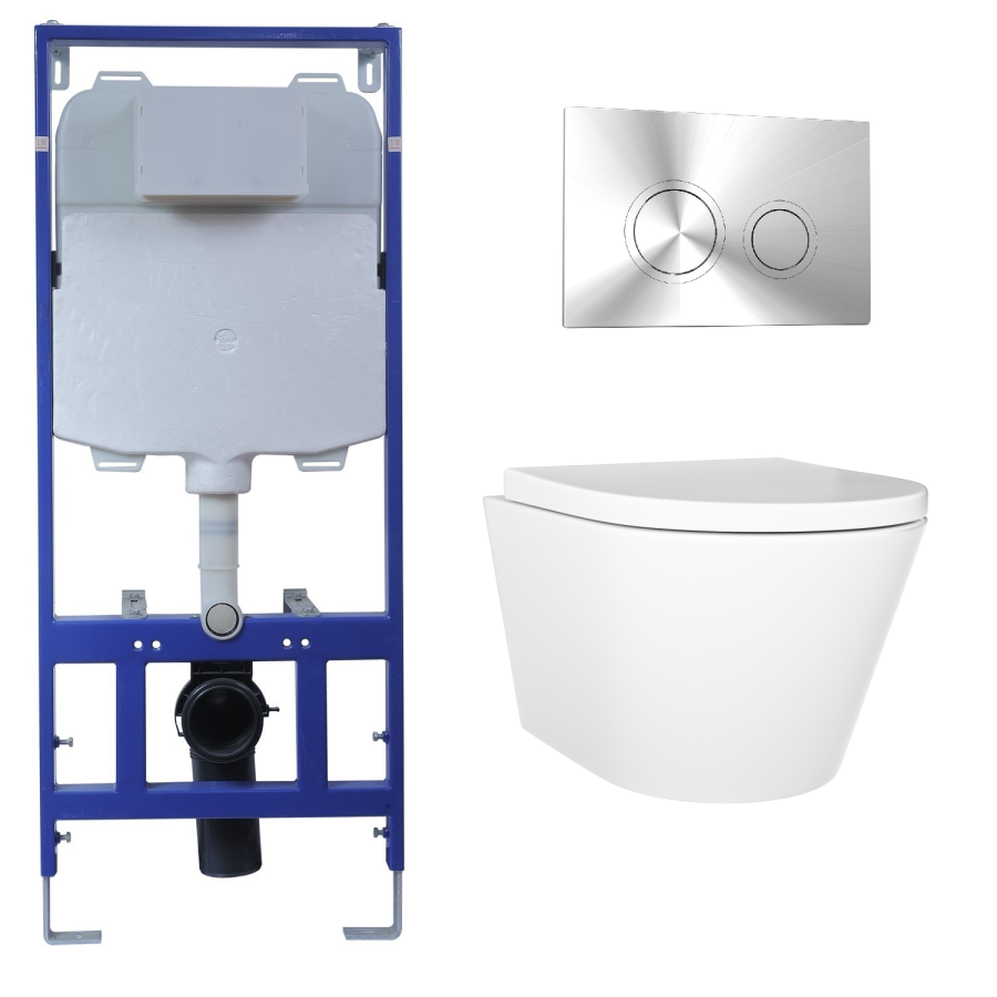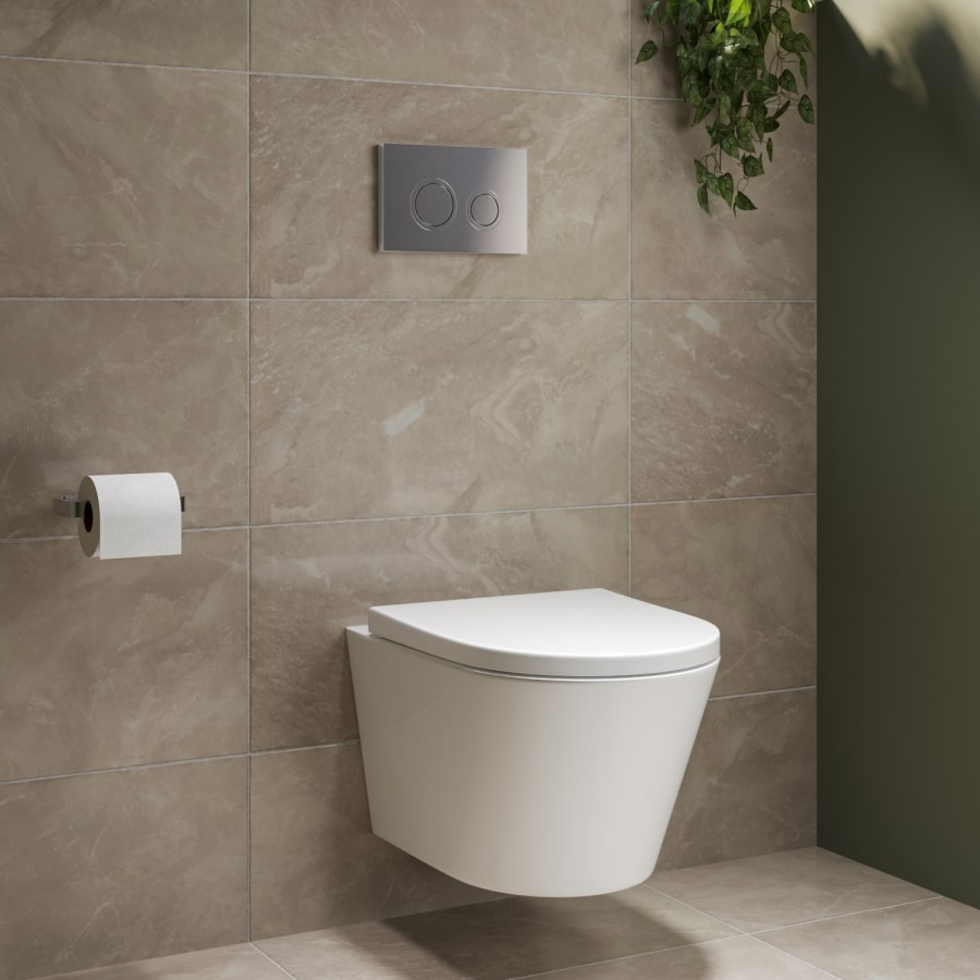 Transform your bathroom with the sleek Newport wall-hung toilet and Zana chrome flush plate. Featuring a round design and glossy white finish, the toilet’s short projection is perfect for compact spaces. The rimless design improves cleanliness and water efficiency, while the soft-close wrap seat ensures quiet operation and easy maintenance. The wall-hung design saves floor space, offering a floating toilet effect with hidden pipework for easy cleaning. Backed by a 5-year warranty for the pan and a 1-year warranty for the seat, it’s designed for lasting durability.