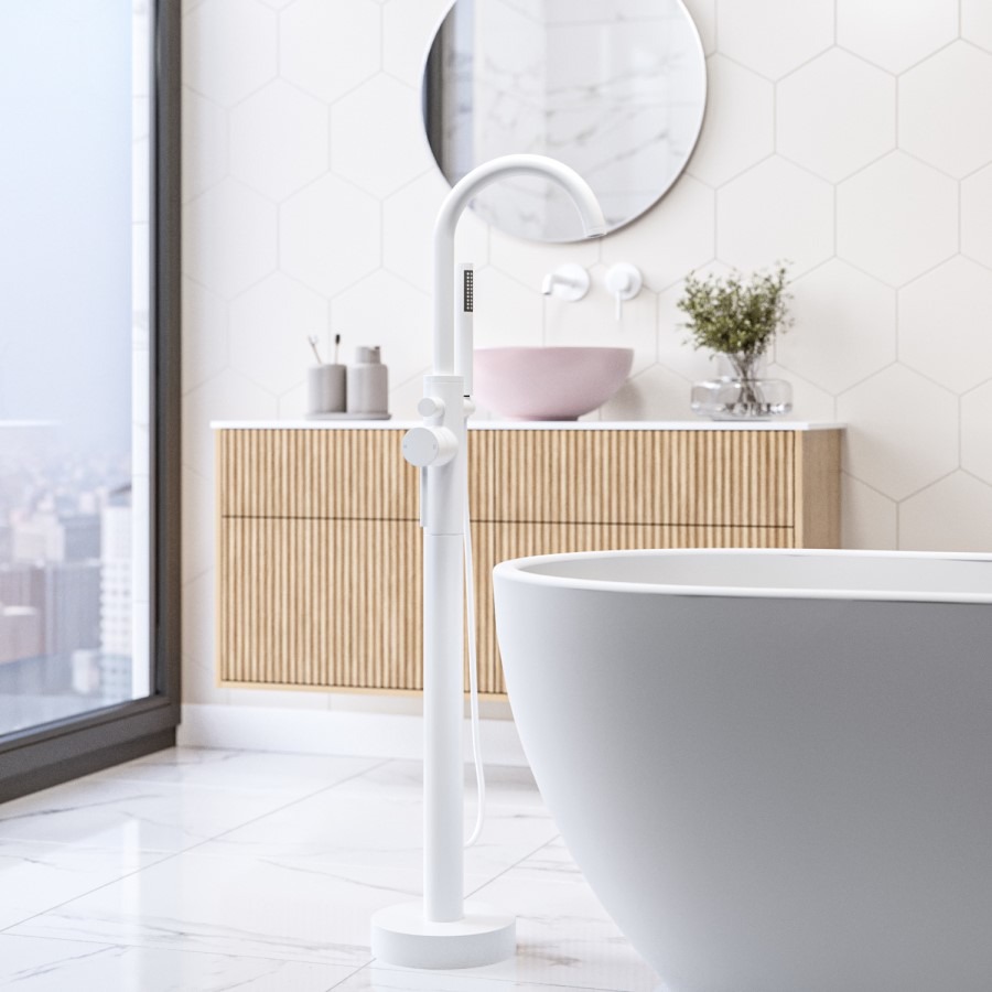 Enhance your bathroom with the Arissa Matt White Freestanding Bath Shower Mixer Tap. Its minimalist silhouette and striking matt white finish bring a fresh, contemporary edge to any space. Designed for practicality as well as aesthetics, the tap integrates a bath filler and shower handset, giving you flexible control at your fingertips. The electroplated finish strengthens the tap’s resistance to rust and corrosion, boosting longevity and endurance. With durable construction and thoughtful detailing, it’s an ideal upgrade for any freestanding bath setup. Backed by a 5-year warranty for function and a 2-year warranty for finish, it delivers both style and lasting performance.